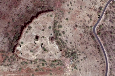 Here's the Google satellite view of the fort; its a triangle with curved sides. On the east is state highway number 134 and on the west is Hidkal reservoir (out of sight). Few spots of importance have been marked-