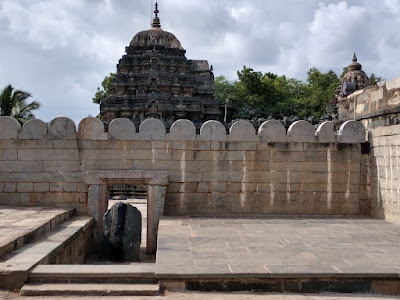 This Trikutachala is not a regular one where its Garbhagriha are part of one original structure. From my understanding on the way the structures are, it seems two temples have been connected to make it seem like one structure. The pillared shelter seen here connects a one-sanctum temple to a two-sanctum temple.